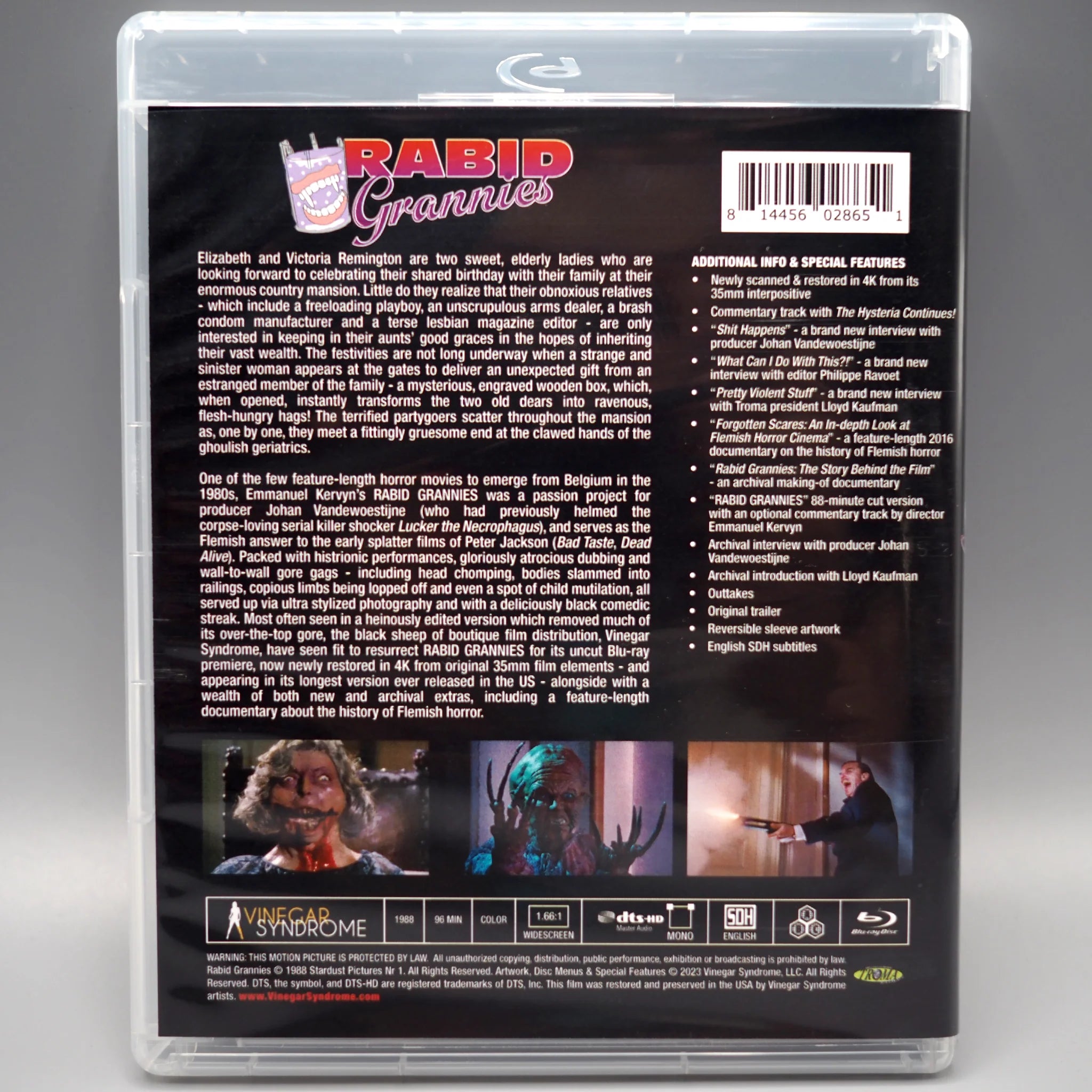 - “RABID GRANNIES” 88-minute cut version (sourced from tape) with an optional commentary track by director Emmanuel Kervyn