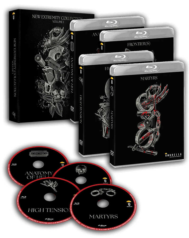 Volume 1 of the New Extremity Collection brings together some defining titles of the movement. HIGH TENSION is an unrelenting, edge-of-your-seat thriller that redefines modern horror with its intense atmosphere and shocking twists. Evocative and provocative, ANATOMY OF HELL, explores the boundaries of intimacy, sexuality, and human vulnerability. FRONTIER(S) brings brutal violence and survival horror to a chaotic, high-stakes level. MARTYRS is a harrowing exploration of pain, suffering, and transcendence. This curation of taboo-busting films is for the true extremity enthusiast seeking films that challenge, provoke, and leave a lasting impact.