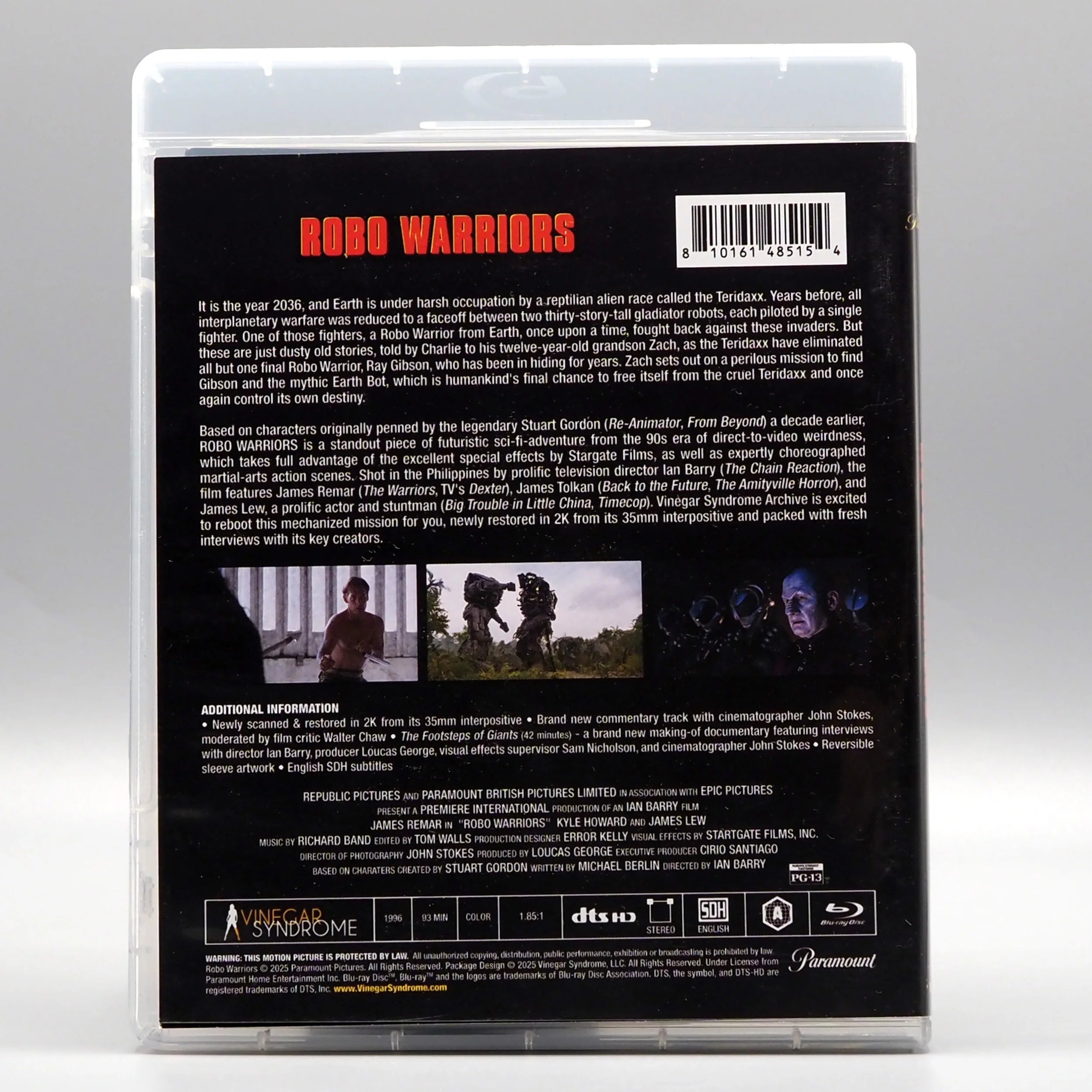 Based on characters originally penned by the legendary Stuart Gordon (Re-Animator, From Beyond) a decade earlier, ROBO WARRIORS is a standout piece of futuristic sci-fi-adventure from the 90s era of direct-to-video weirdness, which takes full advantage of the excellent special effects by Stargate Films, as well as expertly choreographed martial-arts action scenes. Shot in the Philippines by prolific television director Ian Barry (The Chain Reaction), the film features James Remar (The Warriors, TV's Dexter), James Tolkan (Back to the Future, The Amityville Horror), and James Lew, a prolific actor and stuntman (Big Trouble in Little China, Timecop). Vinegar Syndrome Archive is excited to reboot this mechanized mission for you, newly restored in 2K from its 35mm interpositive and packed with fresh interviews with its key creators.