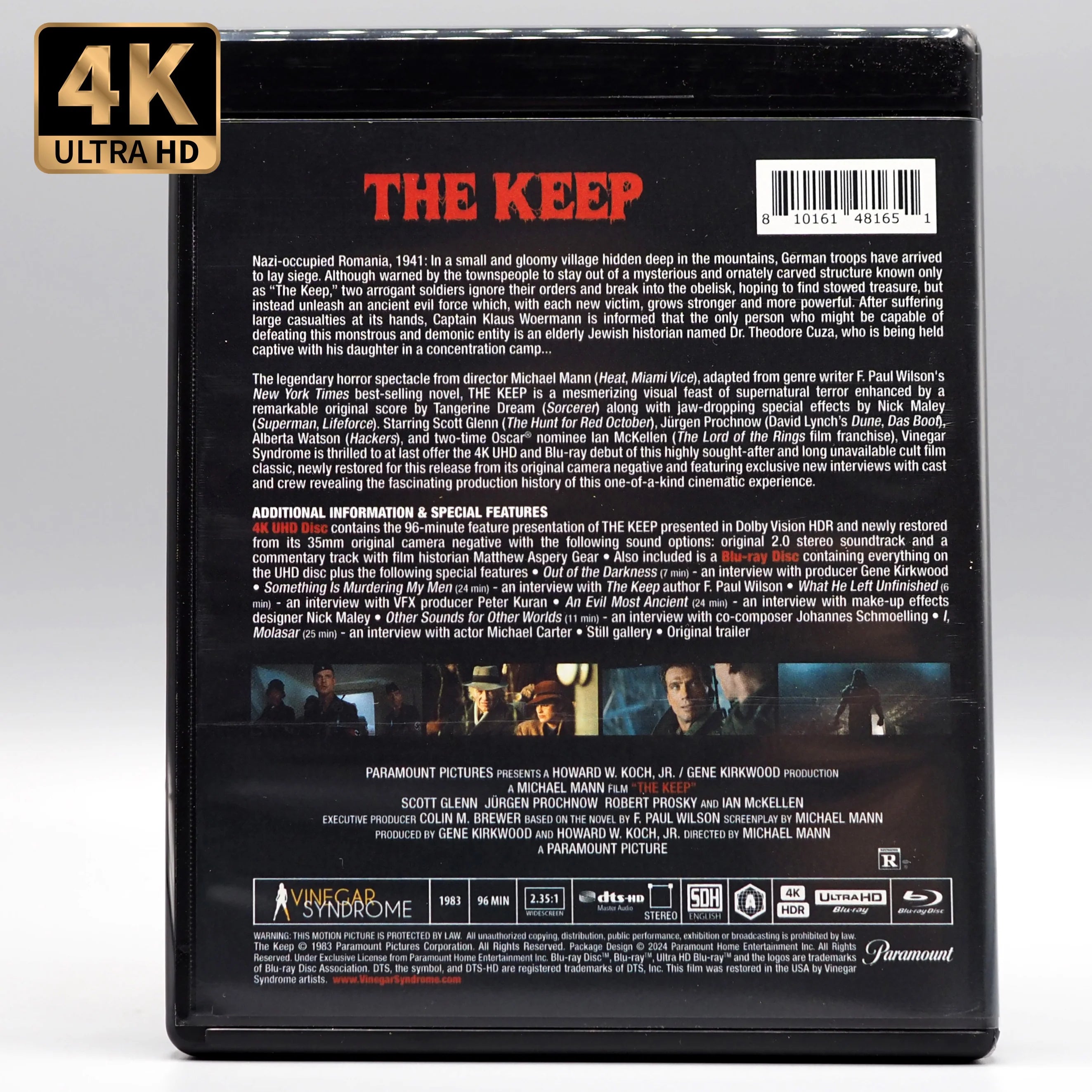 The legendary horror spectacle from director Michael Mann (Heat, Miami Vice), adapted from genre writer F. Paul Wilson’s New York Times best-selling novel, THE KEEP is a mesmerizing visual feast of supernatural terror enhanced by a remarkable original score by Tangerine Dream (Sorcerer) along with jaw-dropping special effects by Nick Maley (Superman, Lifeforce). Starring Scott Glenn (The Hunt for Red October), Jürgen Prochnow (David Lynch’s Dune, Das Boot), Alberta Watson (Hackers), and two-time Oscar® nominee Ian McKellen (The Lord of the Rings film franchise), Vinegar Syndrome is thrilled to at last offer the 4K UHD and Blu-ray debut of this highly sought-after and long unavailable cult film classic, newly restored for this release from its original camera negative and featuring exclusive new interviews with cast and crew revealing the fascinating production history of this one-of-a-kind cinematic experience.