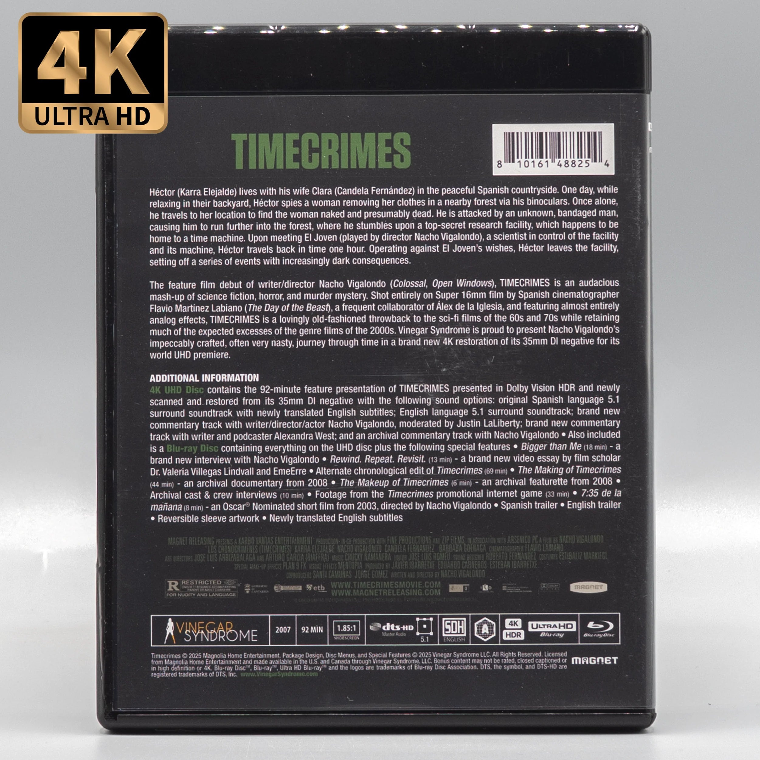 The feature film debut of writer/director Nacho Vigalondo (Colossal, Open Windows), TIMECRIMES is an audacious mash-up of science fiction, horror, and murder mystery. Shot entirely on Super 16mm film by Spanish cinematographer Flavio Martínez Labiano (The Day of the Beast), a frequent collaborator of Álex de la Iglesia, and featuring almost entirely analog effects, TIMECRIMES is a lovingly old-fashioned throwback to the sci-fi films of the 60s and 70s while retaining much of the expected excesses of the genre films of the 2000s. Vinegar Syndrome is proud to present Nacho Vigalondo’s impeccably crafted, often very nasty, journey through time in a brand new 4K restoration of its 35mm DI negative for its world UHD premiere.